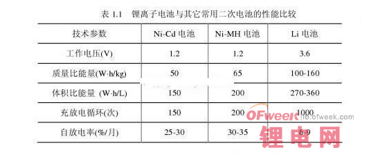 如表1.1所示,和Ni-Cd等其它二次電池相比,鋰離子電池具有更高的能量密度(包括質(zhì)量比能量和體積比能量)、更高的充放電循環(huán)、更低的放電率和更高的單節(jié)電池工作電壓(3.6V)。顯然,鋰離子電池的高工作電壓將有利于減小移動裝備的尺寸,高能量密度將有利于電池的輕量化,低放電率也能保證存儲期間的正常使用。