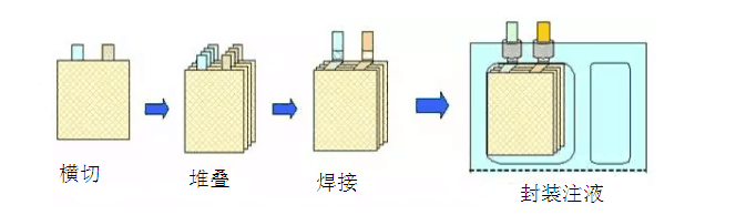 將電池極片進(jìn)行分條、烘干之后,下一步是制作電芯。電芯制作方式可以分為疊片式和卷繞式兩種。疊片式是將正負(fù)極極片、隔膜裁成規(guī)定尺寸的大小,隨后將正極極片、隔膜、負(fù)極極片疊合成小電芯單體,然后將小電芯單體疊放并聯(lián)起來(lái)組成一個(gè)大電芯,下圖所示。