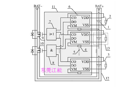 其中:1為單節(jié)鋰離子電池;2為充電過電壓分流放電支路電阻;3為分流放電支路控制用開關(guān)器件;4為過流檢測(cè)保護(hù)電阻;5為省略的鋰電池保護(hù)芯片及電路連接部分;6為單節(jié)鋰電池保護(hù)芯片(一般包括充電控制引腳CO,放電控制引腳DO,放電過電流及短路檢測(cè)引腳VM,電池正端VDD,電池負(fù)端VSS等);7為充電過電壓保護(hù)信號(hào)經(jīng)光耦隔離后形成并聯(lián)關(guān)系驅(qū)動(dòng)主電路中充電控制用MOS管柵極;8為放電欠電壓、過流、短路保護(hù)信號(hào)經(jīng)光耦隔離后形成串聯(lián)關(guān)系驅(qū)動(dòng)主電路中放電控制用MOS管柵極;9為充電控制開關(guān)器件;10為放電控制開關(guān)器件;11為控制電路;12為主電路;13為分流放電支路。單節(jié)鋰電池保護(hù)芯片數(shù)目依據(jù)鋰電池組電池?cái)?shù)目確定,串聯(lián)使用,分別對(duì)所對(duì)應(yīng)單節(jié)鋰電池的充放電、過流、短路狀態(tài)進(jìn)行保護(hù)。該系統(tǒng)在充電保護(hù)的同時(shí),通過保護(hù)芯片控制分流放電支路開關(guān)器件的通斷實(shí)現(xiàn)均衡充電,該方案有別于傳統(tǒng)的在充電器端實(shí)現(xiàn)均衡充電的做法,降低了鋰電池組充電器設(shè)計(jì)應(yīng)用的成本。