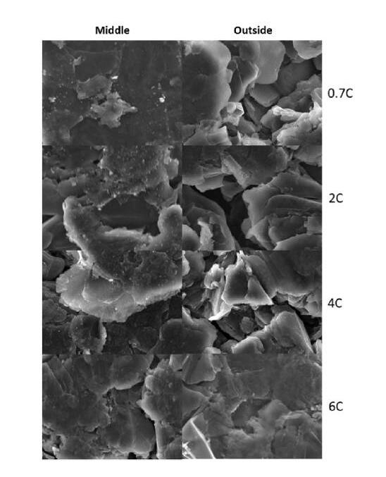 通過拆解循環(huán)后的電池,隨著充電速率的增加,負(fù)極的顏色也發(fā)生了改變,在0.7C和2C的充電倍率下,電極呈現(xiàn)了均一的顏色,而到充電倍率提高到4C,電極的中間位置呈現(xiàn)出了灰色,而在6C的倍率下,不但中間部分的電極呈現(xiàn)除灰色,中間部分的活性物質(zhì)還出現(xiàn)了脫落的現(xiàn)象。SEM掃描發(fā)現(xiàn),在0.7C和2C的倍率下,電極表面呈現(xiàn)除原始的狀態(tài),但是在4C的倍率下,電極表面開始出現(xiàn)一些亮點,6C的倍率下,電極的表面狀態(tài)則明顯不同了,由于SEI膜厚度的增加,已經(jīng)難以分辨單獨的石墨顆粒了。