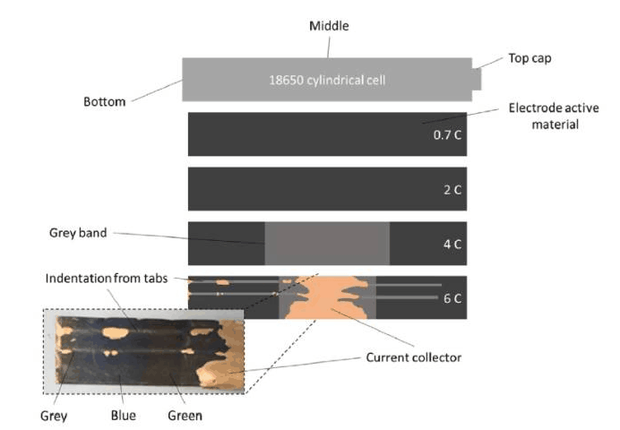 實驗中L. Somerville采用了商業(yè)的NMC/石墨18650電池,以盡可能還原商用鋰離子電池中石墨負(fù)極的工作狀態(tài)。充電速率被設(shè)定為0.7,2,4,6C,放電速率為C/3,電池溫度控制在25℃。